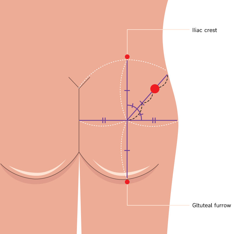 Draw an Imaginary Line: From the ASIS, draw an imaginary line straight down to the midpoint of the buttock. This helps in identifying the upper outer quadrant.